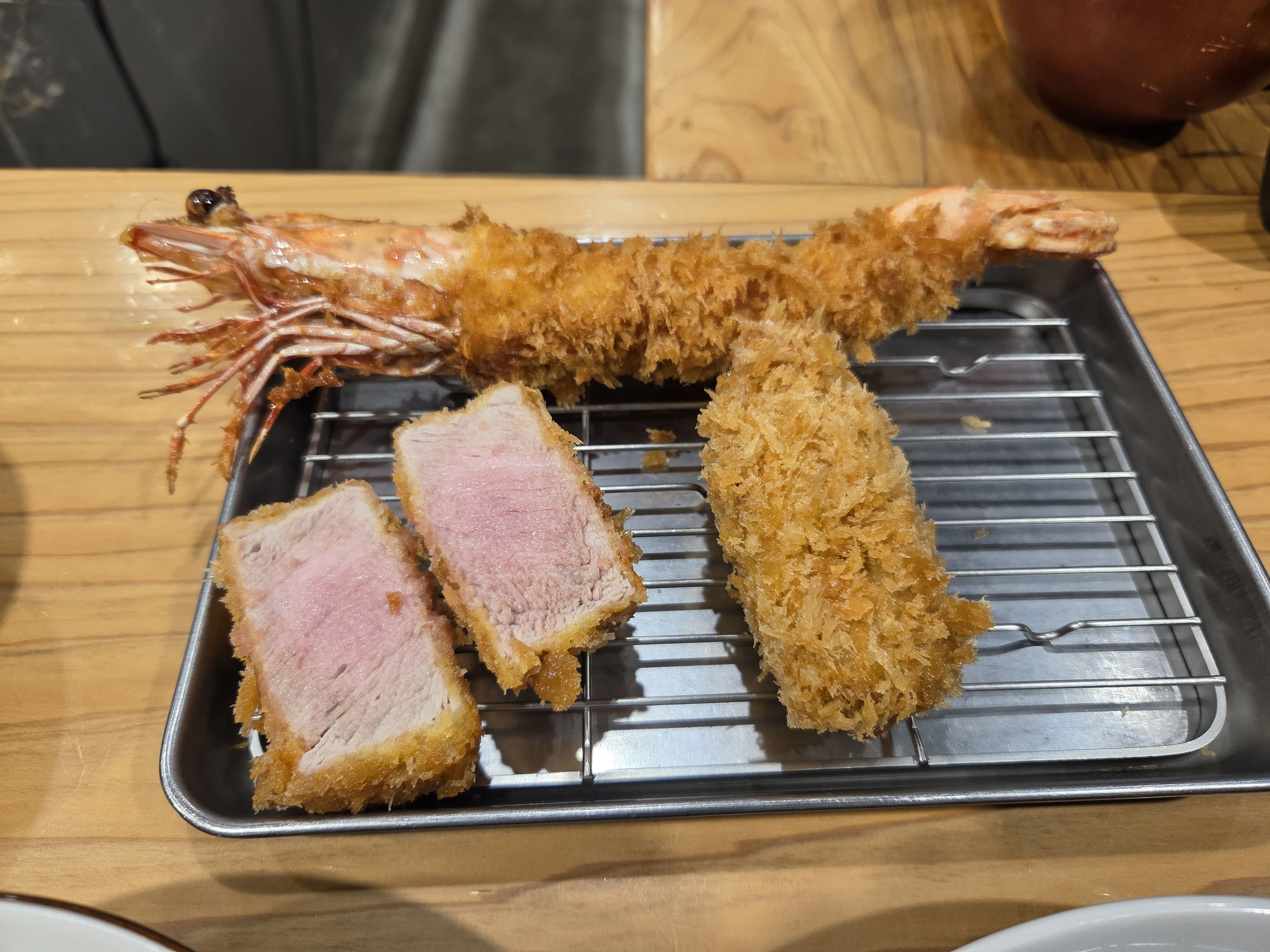 1시간 정도의 웨이팅 끝에 식사를 시작합니다. 믹스 후라이 정식(ミックスフライ定食) 특상을 시켰는데, 한상에 다 나오는 게 아니라 하나씩 튀겨서 놔줍니다. 닭 안심카츠, 등심카츠, 안심카츠, 멘치카츠, 키스후라이(キスフライ), 새우튀김 순으로 나옵니다. 3300엔짜리 코스인데, 확실히 제값 하는 맛이 납니다. 여행의 시작이 좋네요.
