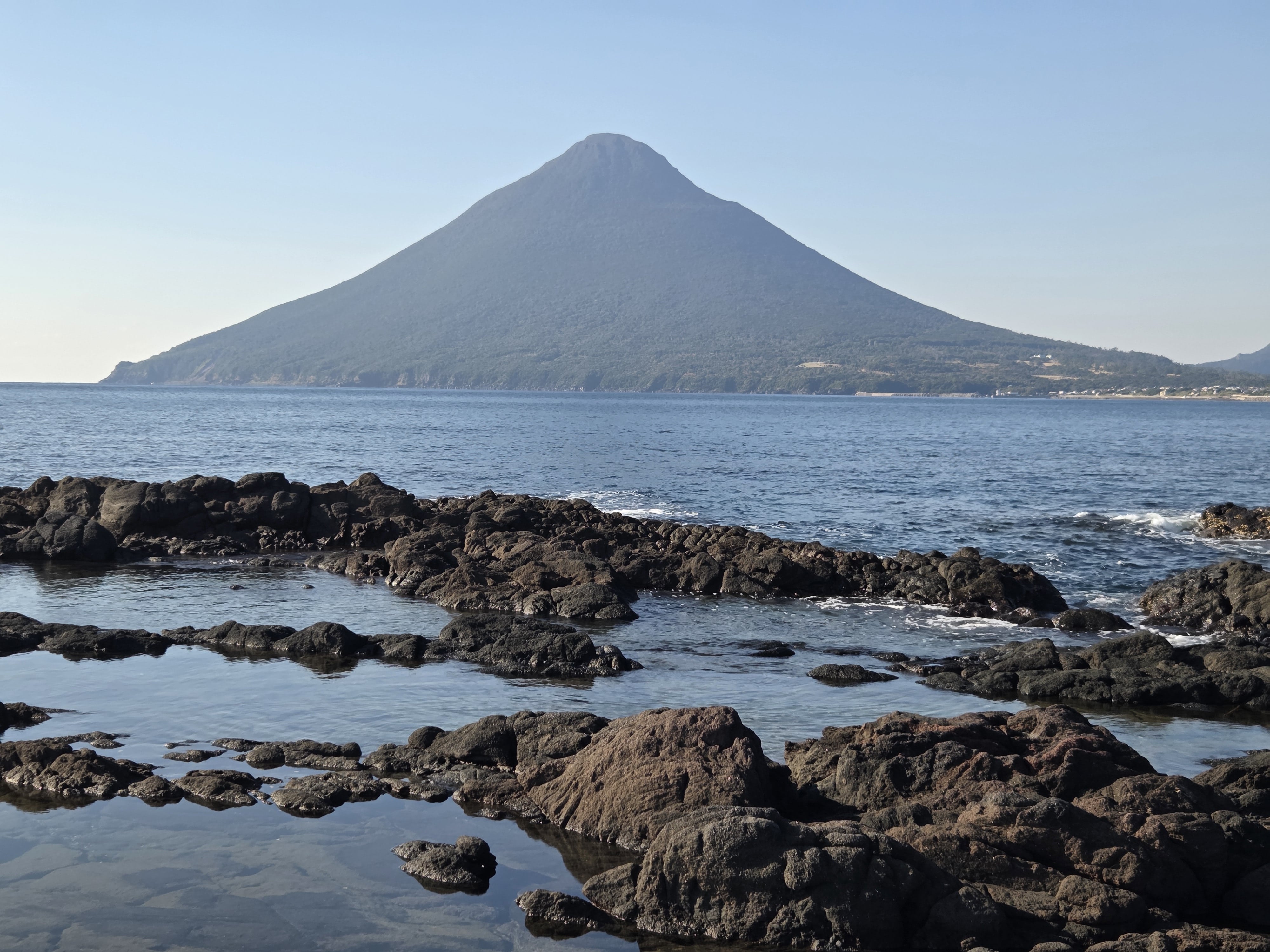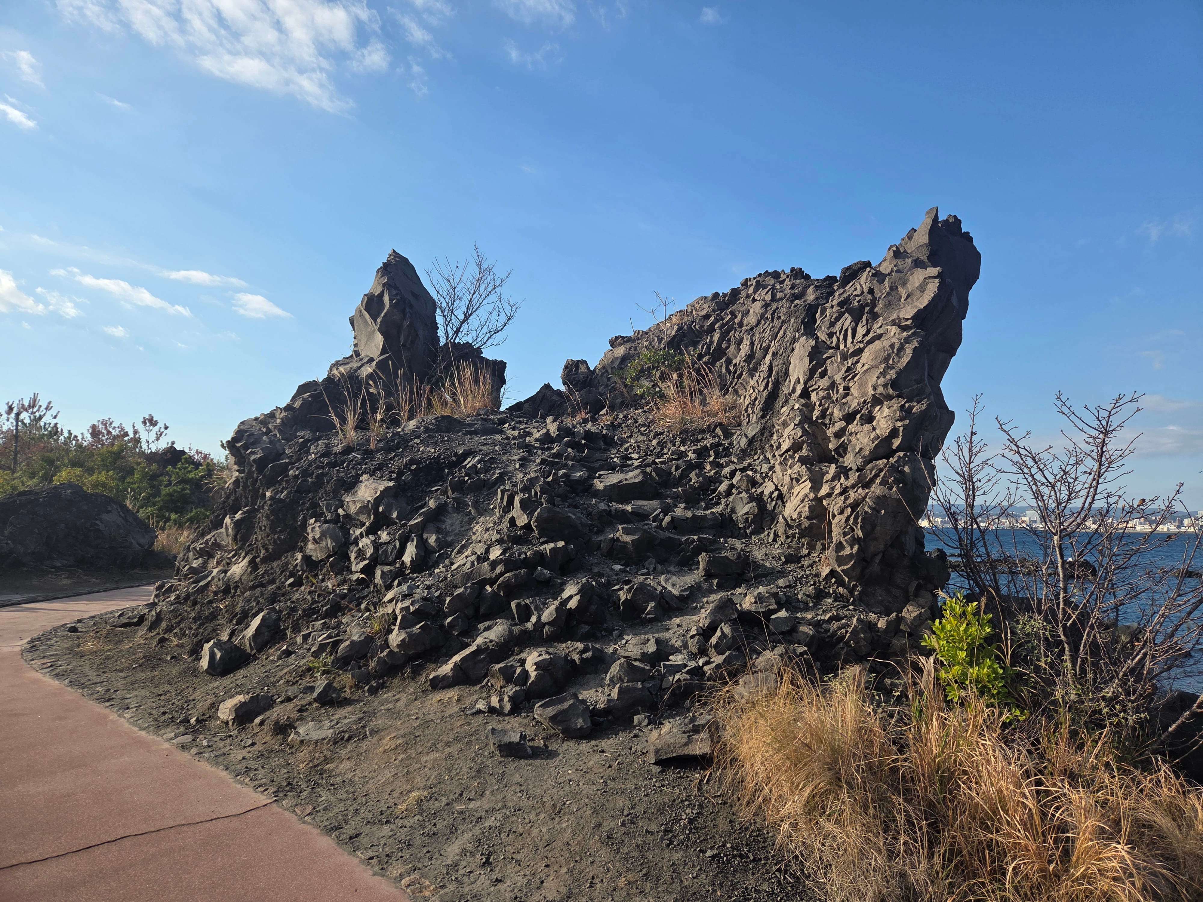 요간 나기사 공원에서 좀 많이 걸어서 도착한 곳은 가라스지마 텐보쇼(烏島展望所). 이곳은 사쿠라지마와는 별개의 섬이었지만 1914년 대분화 때 흘러나온 용암으로 사쿠라지마와 한 섬이 되었다고 합니다. 주변에 사각정이 있어 앉아서 사쿠라지마 화산을 볼 수도 있습니다.