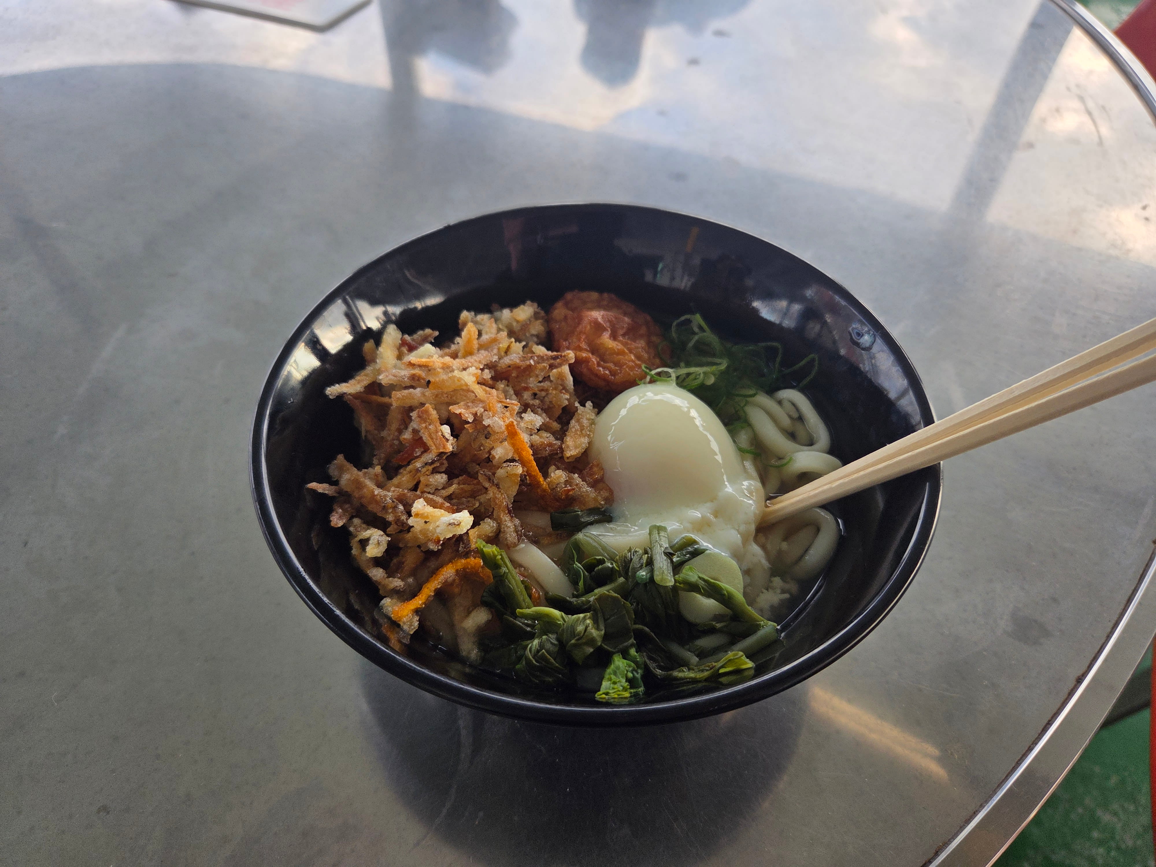 갓 나온 우동을 받아서 실외 테이블석에 앉았습니다. 1000엔짜리 사쿠라지마 우동을 시켰는데, 각종 고명이 가득합니다. 사쿠라지마로 가는 배에서 먹는 우동은 낭만을 한 스푼 얹어 더욱 맛이 좋았습니다.