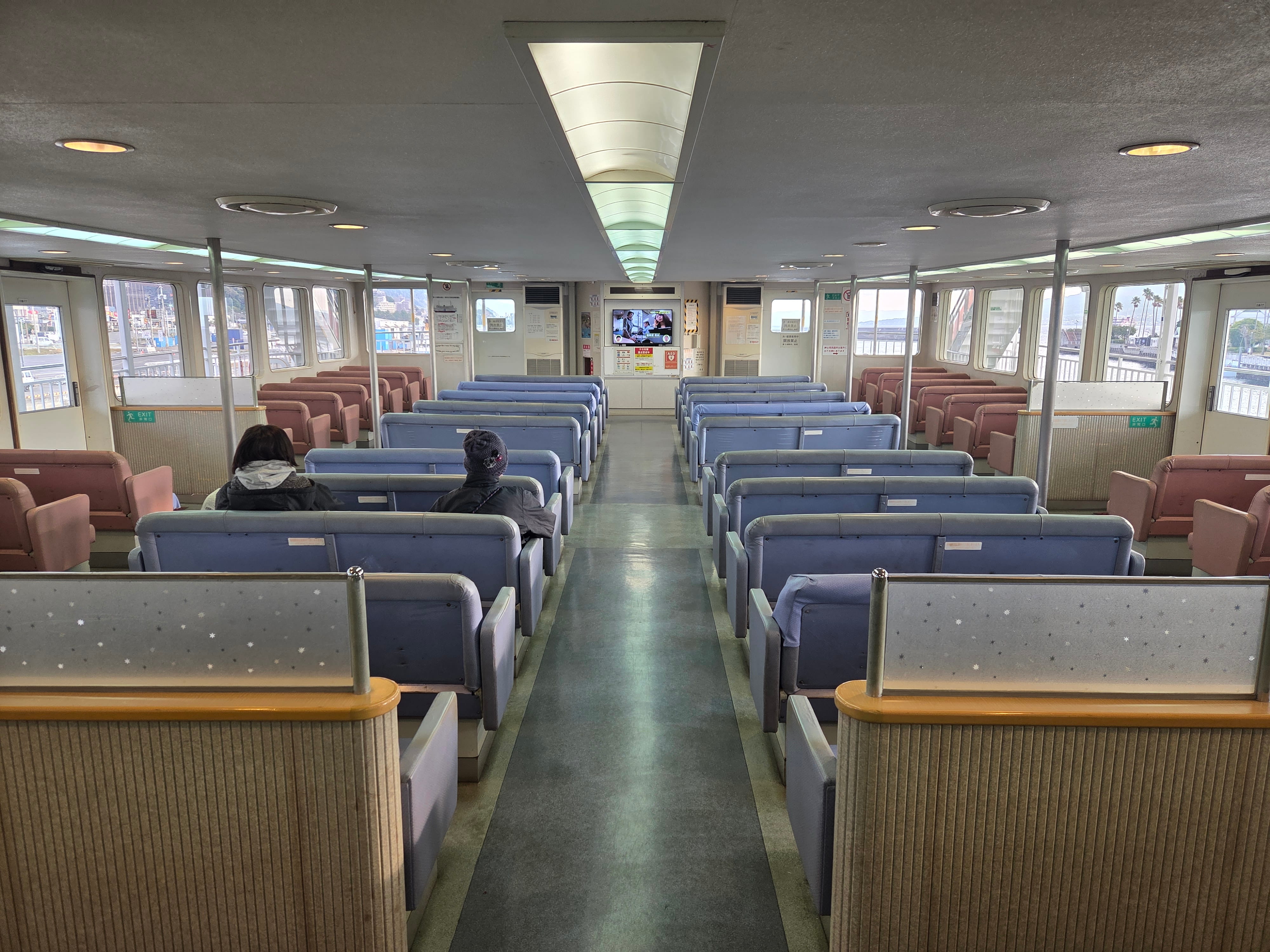 페리 터미널에 도착해 사쿠라지마 페리에 탑승합니다. 단거리를 운항하는 것에 맞지 않게 페리가 상당히 큽니다. 오후에 탔던 페리에는 실내에서 사쿠라지마를 조망할 수 있는 테이블석이 있었는데, 오전에 탔던 페리의 내부는 좀 달랐습니다.